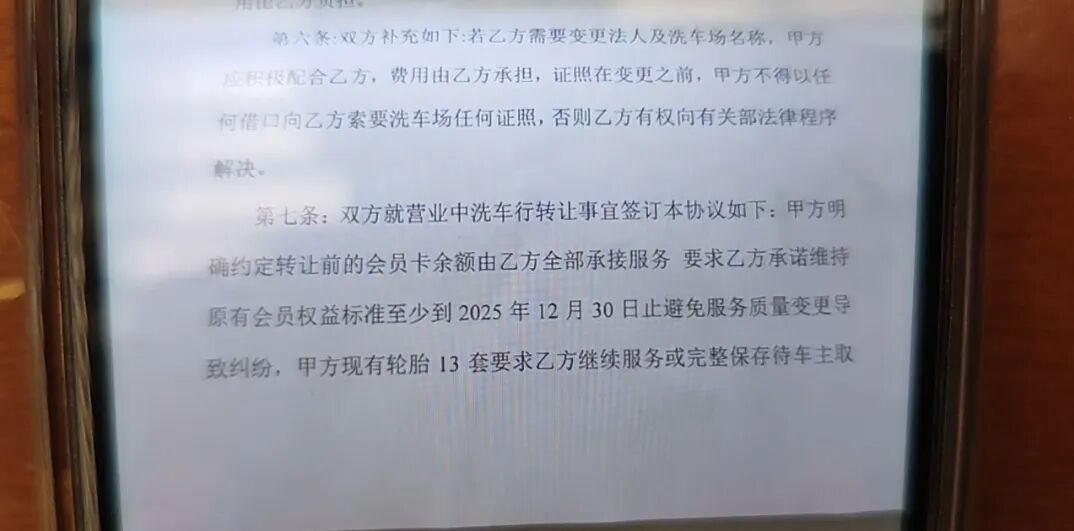 现老板就此事回应,所有储值卡均为前老板办理,他接手时未获得相关费用,目前是“免费为会员服务”。据其透露,原有储值余额约17万元,目前已消化1万元,剩余16万余元。现老板还出示了转让合同,其中约定“转让方需承诺,维持原有会员权益标准至少至12月30日,避免因服务变更引发纠纷”。